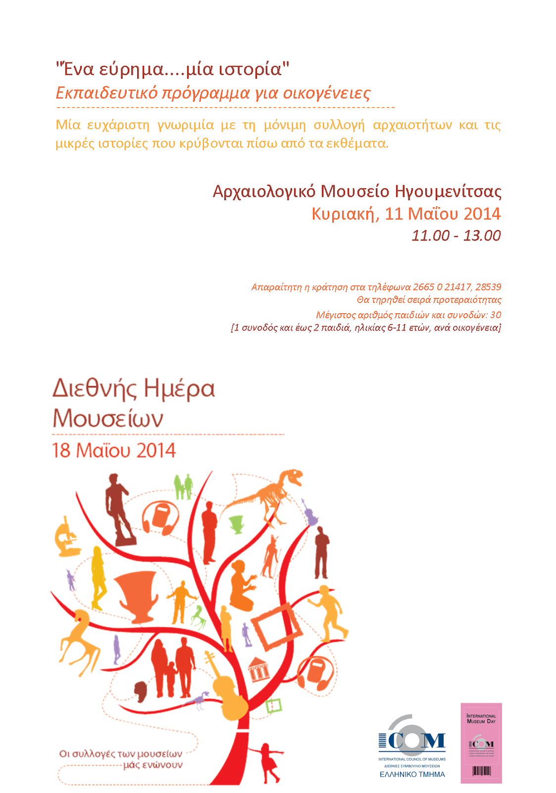 Η ΛΒ΄ Εφορεία Προϊστορικών και Κλασικών Αρχαιοτήτων σας καλεί να λάβετε μέρος στον εορτασμό της Διεθνούς Ημέρας Μουσείων, που διοργανώνεται από το Διεθνές Συμβούλιο Μουσείων (ICOM) και είναι φέτος αφιερωμένη στη θεματική «Οι συλλογές των μουσείων μας ενώνουν», συμμετέχοντας στο εκπαιδευτικό πρόγραμμα για οικογένειες «Ένα εύρημα….μία ιστορία», που θα υλοποιηθεί την Κυριακή 11 Μαΐου 2014 στο Αρχαιολογικό Μουσείο Ηγουμενίτσας.