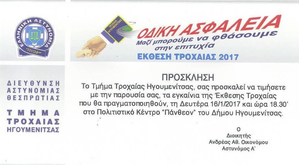 Η λειτουργία της Έκθεσης Τροχαίας θα διαρκέσει κατά το χρονικό διάστημα από 16 έως 20 Ιανουαρίου 2017, κατά τις ώρες 09:00 έως 14:00 και 16:00 έως 21:00.