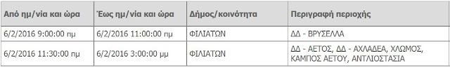 Διακοπές ηλεκτρικού ρεύματος το Σάββατο σε περιοχές των Φιλιατών