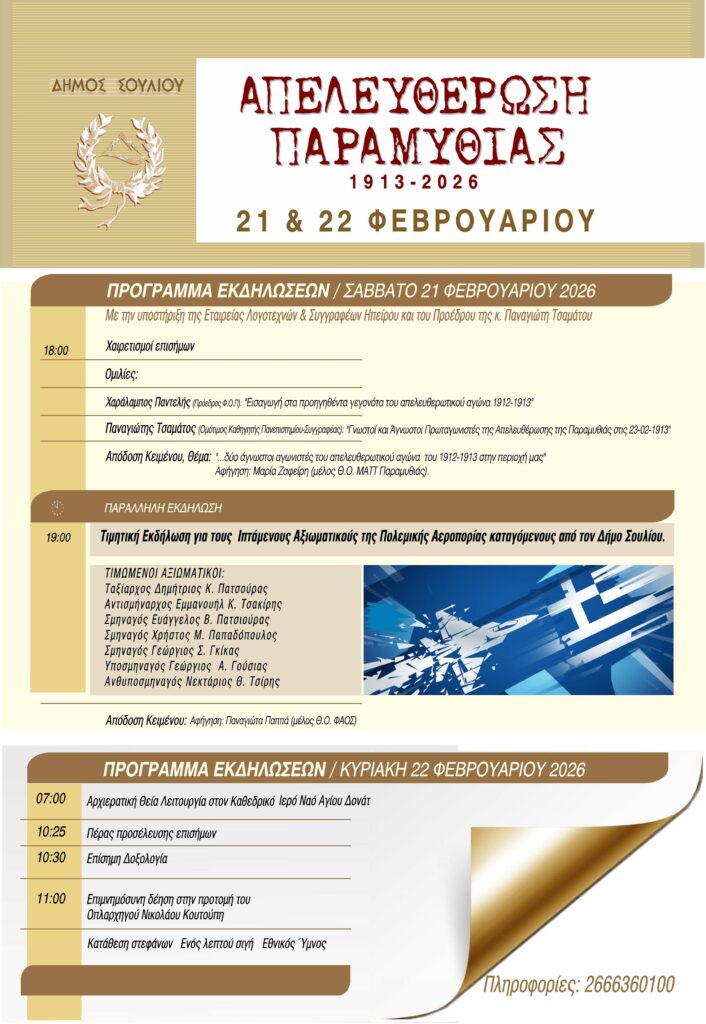 Με διήμερο εκδηλώσεων τιμά ο Δήμος Σουλίου την επέτειο της απελευθέρωσης της Παραμυθιάς (1913–2026), το Σάββατο 21 και την Κυριακή 22 Φεβρουαρίου 2026.