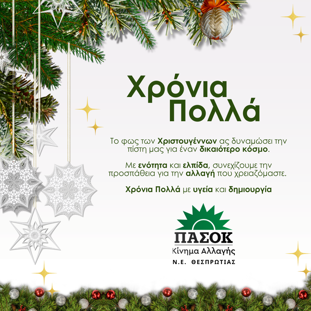 Η Ν.Ε. ΠΑΣΟΚ Θεσπρωτίας εύχεται σε όλες και όλους καλές γιορτές. Το φως των Χριστουγέννων ας μας δώσει δύναμη, ενότητα και ελπίδα, ώστε να συνεχίσουμε με συνέπεια την προσπάθεια για έναν δικαιότερο κόσμο και την αλλαγή που έχει ανάγκη η κοινωνία.