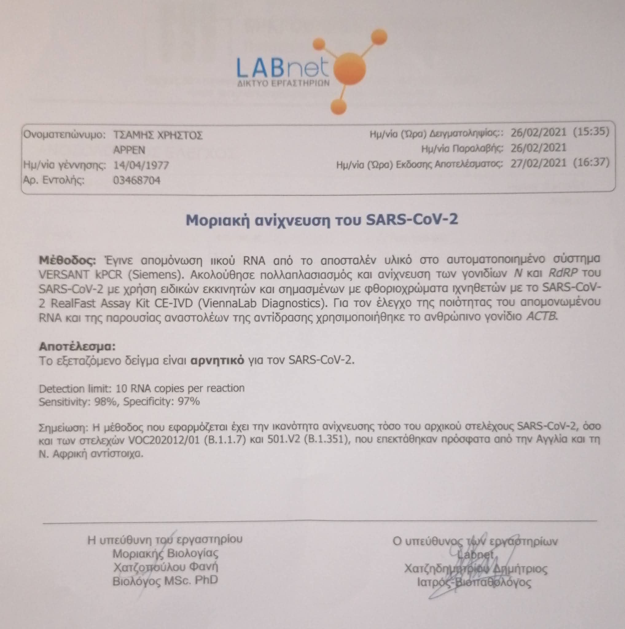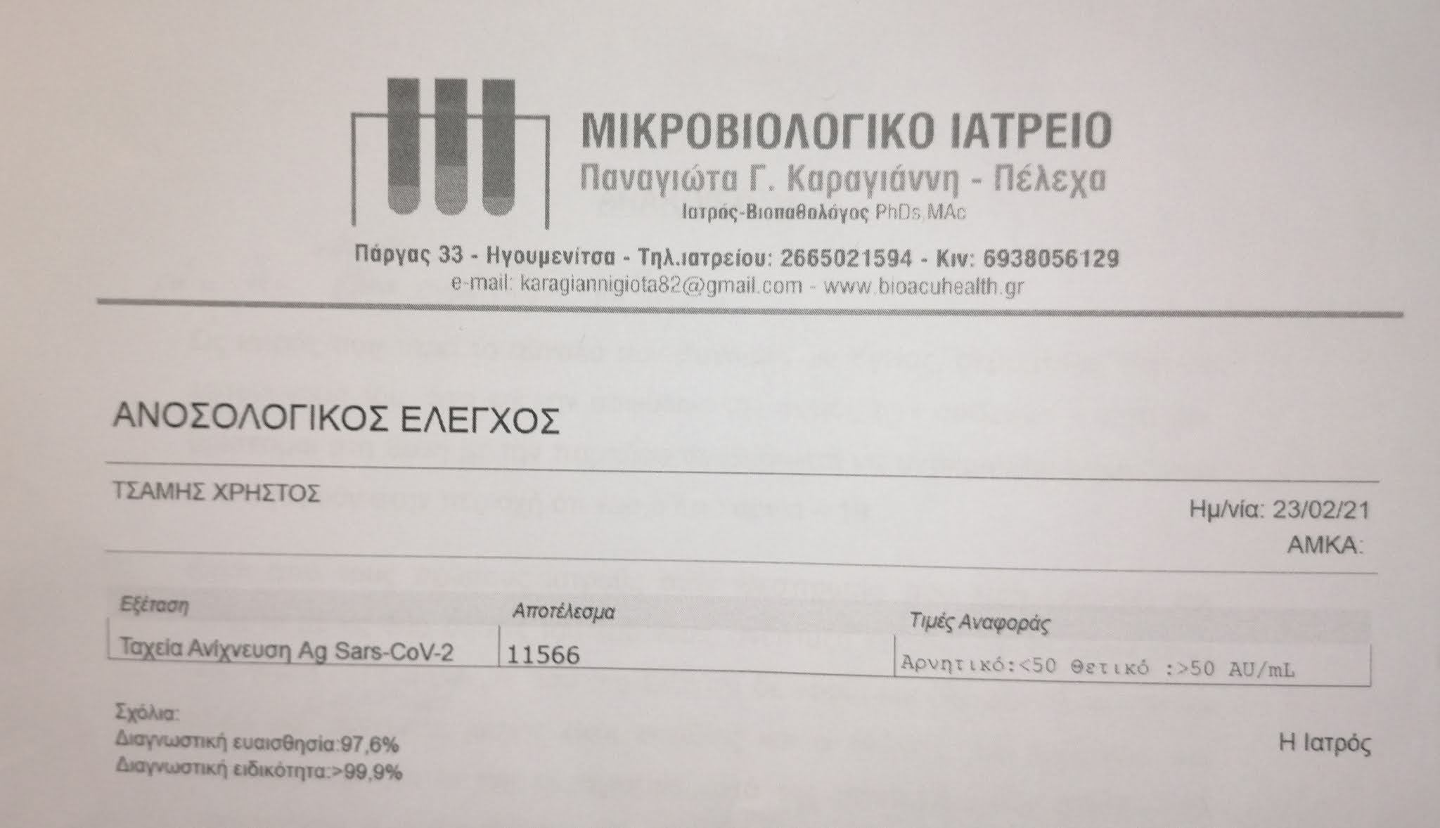 Προς απόδειξη των λεγομένων μου δημοσιεύω το τεστ αντισωμάτων και το πρόσφατο μοριακό τεστ που είναι αρνητικό.
