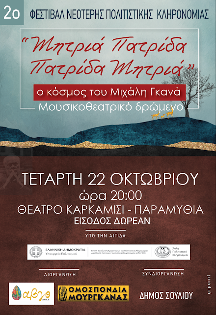 Στο πλαίσιο του 2ου Φεστιβάλ Νεότερης Πολιτιστικής Κληρονομιάς, παρουσιάζεται την Τετάρτη 22 Οκτωβρίου, στις 20:00, στο Θέατρο Καρκαμίσι στην Παραμυθιά, το μουσικοθεατρικό δρώμενο «Μητριά Πατρίδα – Πατρίδα Μητριά: ο κόσμος του Μιχάλη Γκανά».
