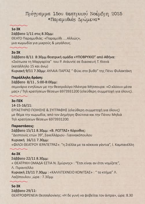 Από τις 14 έως τις 16 Νοεμβρίου ακολουθεί εργαστήριο ποίησης και συγγραφής με τον Δημήτρη Φουτσιά και την Πένυ Μηλιά, ενώ το επόμενο Σαββατοκύριακο θα παρουσιαστούν οι παραστάσεις «Β. Ρώτας» από την ομάδα «Φίλοι Θεάτρου Ηγουμενίτσας» και «Τέλειοι γονείς» από την ομάδα «Εστία».