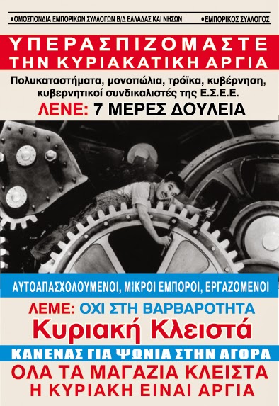 Η πλήρης κατάργηση της Κυριακάτικης Αργίας όπως δρομολογήθηκε το 2013 – αν τους αφήσουμε – θα συνεχιστεί και θα επεκταθεί το 2014.