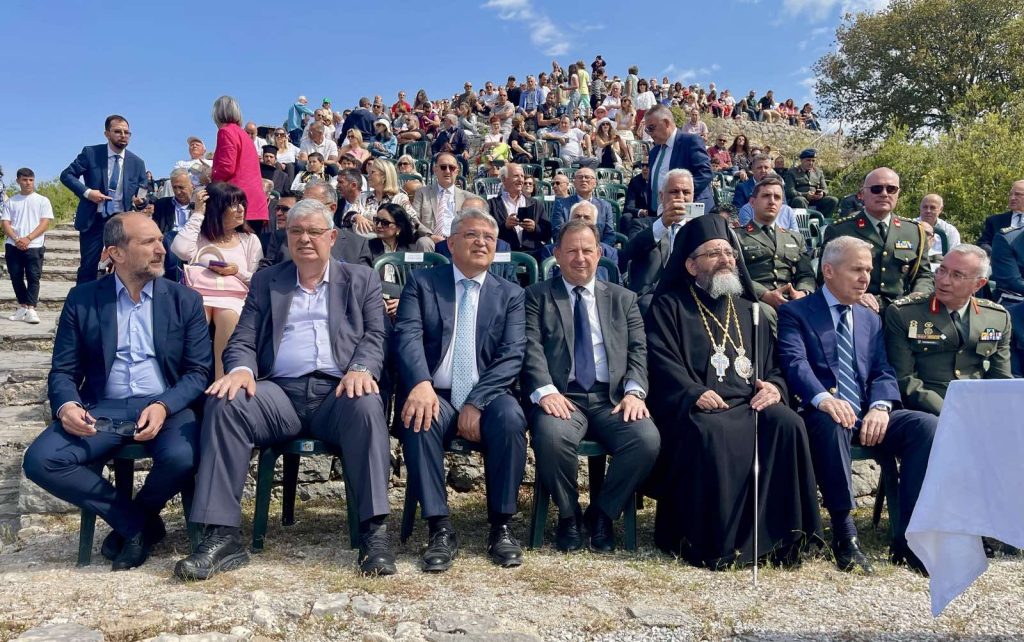 Στο Αμφιθέατρο εκφωνήθηκε ο πανηγυρικός της ημέρας από τον ομότιμο καθηγητή του Πανεπιστημίου Ιωαννίνων Παναγιώτη Παπακωνσταντίνου, ενώ ξεχωριστή στιγμή αποτέλεσε η αναπαράσταση της ανατίναξης της Μονής Κουγκίου.