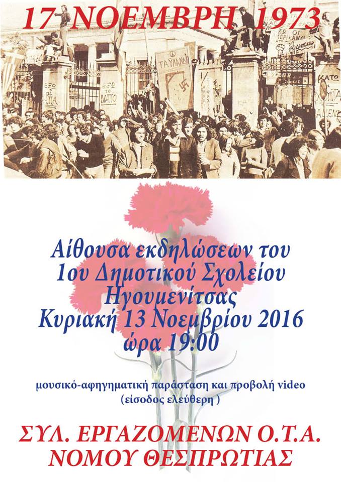 Ο Σύλλογος Εργαζομένων ΟΤΑ Ν Θεσπρωτίας σας προσκαλεί στην εκδήλωση αφιέρωμα για την επέτειο του πολυτεχνείου, την Κυριακή 13 Νοεμβρίου 2016 και ώρα 19.00, στο Ά Δημοτικό Σχολειό Ηγουμενίτσας.
