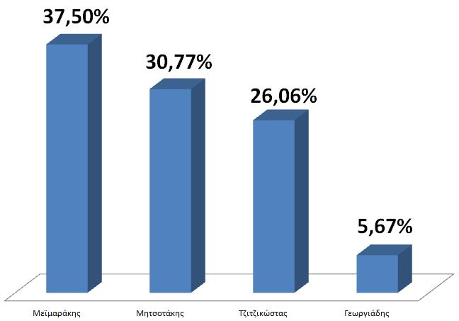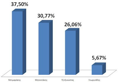 Σαφές το προβάδισμα στο Νομό για τον Ευάγγελο Μεϊμαράκη ο οποίος με 813 ψήφους και ποσοστό 37,50% παίρνει σαφές προβάδισμα έναντι του Κυριάκου Μητσοτάκη που έρχεται δεύτερος με 667 ψήφους και ποσοστό 30,77%.