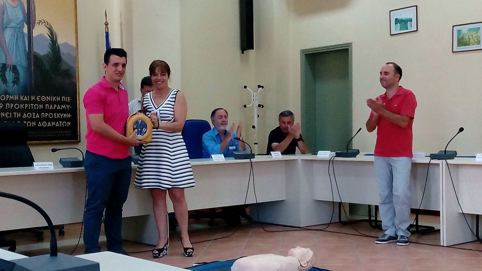 Η δημαρχος αφου ευχαριστησε τον κ. Παππα για την ευγενικη προσφορα του , στους κατοικους του Δημου και τους επισκεπτες ευχηθηκε η πραξη του να βρει μιμητες και αναθερθηκε στην αναγκη περαν του απαραιτητου εξοπλισμου εκπαιδευσης και πιστοποιησης χρησης απινιδωτη,τονιζοντας την προθεση της Δημοτικης αρχης πιστοποιησης των υπαλληλων του Δημου με εξειδικευμενα σεμιναρια.