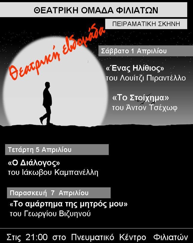 Οι παραστάσεις θα δοθούν στο πνευματικό κέντρο Φιλιατών και θα αρχίζουν στις 21.00