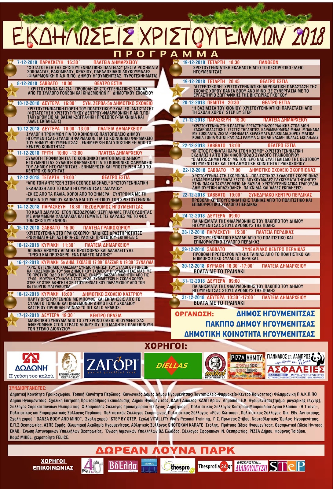 · Παρασκευή 14-12-2018 στις 18:30 στον πεζόδρομο Ηγουμενίτσας εκδήλωση από το ΚΔΑΠ Δίαυλος του Δήμου Ηγουμενίτσας «σεργιανάμε τραγουδώντας με αναμμένα φαναράκια και γεμάτες τις καρδιές με το φως των Χριστουγέννων»